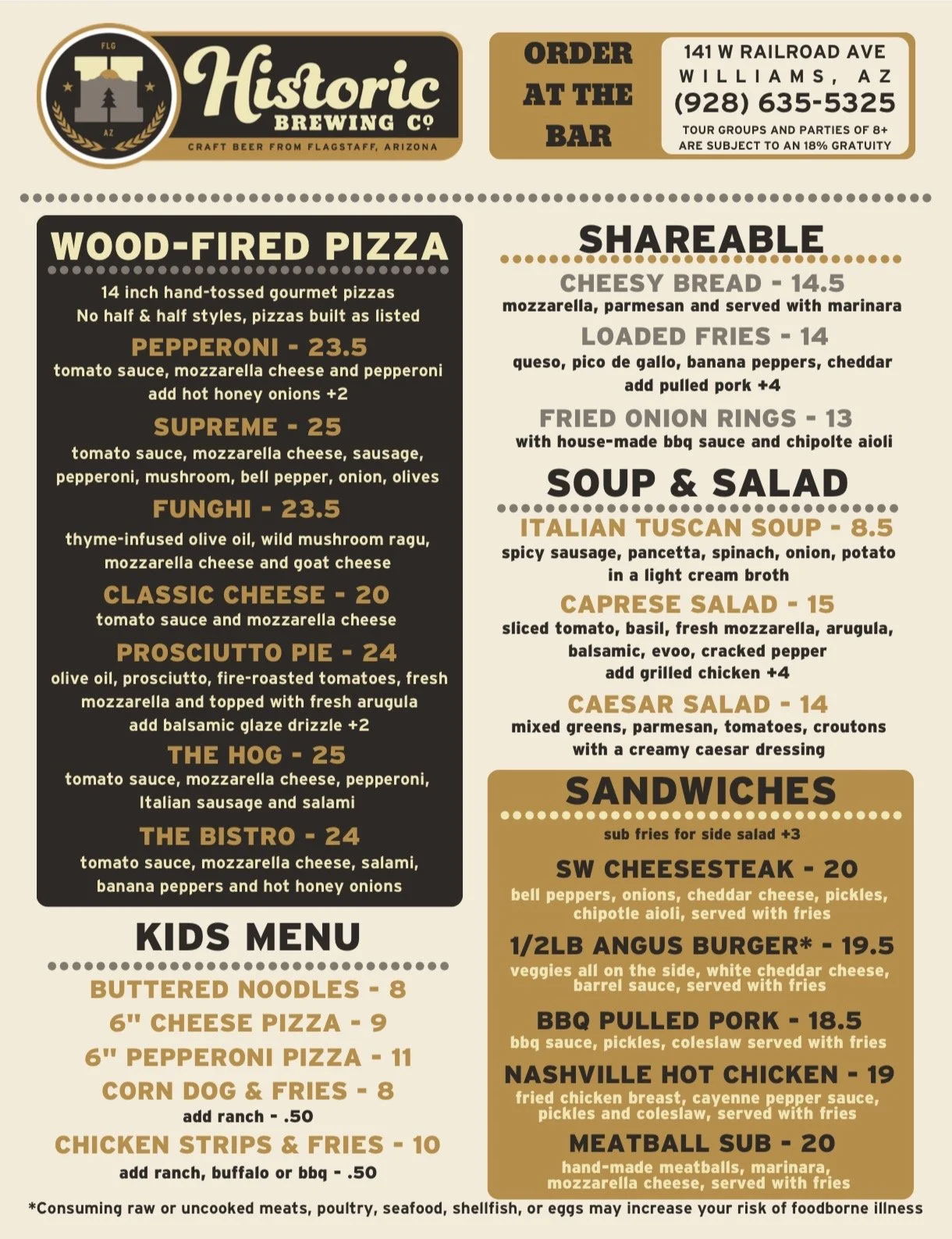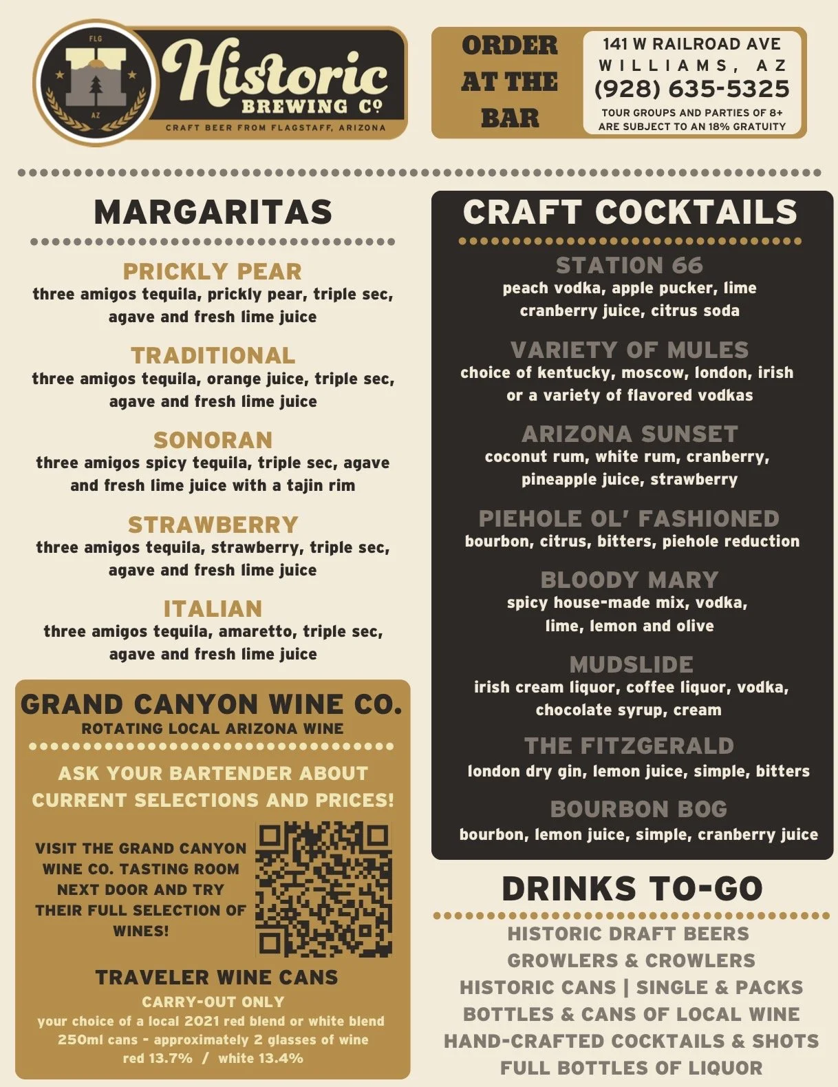 Historic's - Downtown Williams location is the perfect place to bring your family and friends! We offer 16 craft beers on draft, local Arizona wine, and a variety of signature and classic cocktails. Our menu has options for everyone, including gluten-free and vegetarian choices, that can be enjoyed inside our spacious dining room or on our beautiful dog-friendly patio.